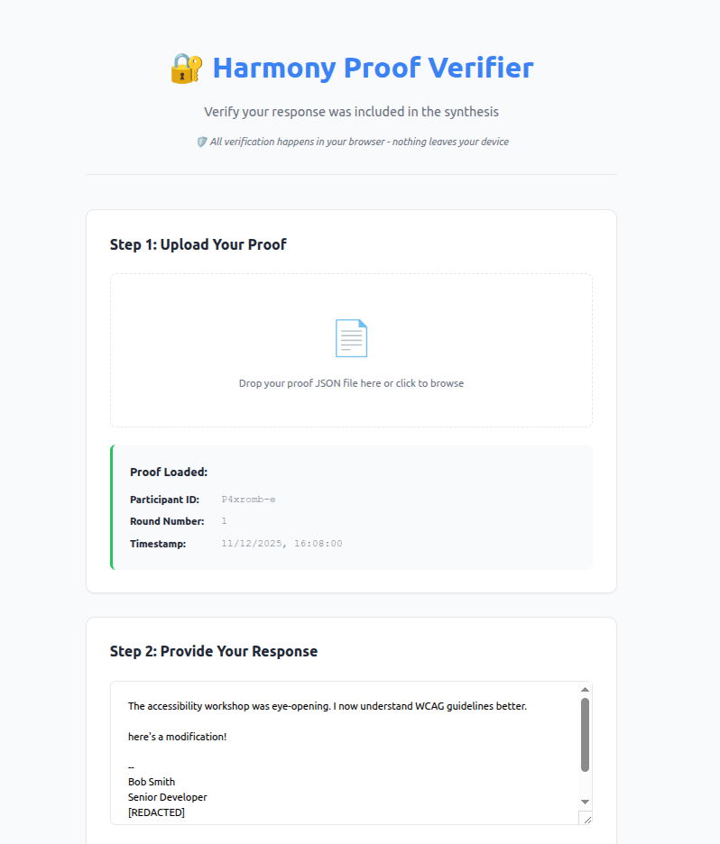 To test it, you need to pretend you participated in an assembly. This means you would have sent an email with some opinion or feedback to Harmony by email and at the end of the round you received a synthesis report and your inclusion proof. Instead, you can paste the information below and save them as files to upload into the UI. Nothing leaves your machine - all the processing is done locally in the browser.