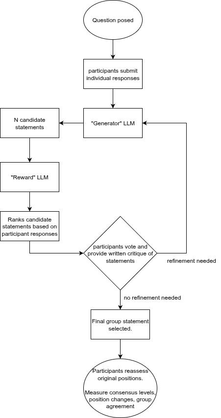 There have been several experiments with LLM powered consensus over the past couple of years. The introduction of LLMs into social choice theory has led to the emergence of “generative social choice” - a theoretical framework that “combines the mathematical rigour of social choice theory with the ability of LLMs to generate text and extrapolate preferences”. The overall aim is to overcome the limitation of social choice, which can only handle finite, predetermined options, by enabling the discourse and the outcomes to be open-ended and perhaps unforeseeable. Also, LLMs allow participants to express their preferences implicitly and indirectly, with the LLM being able to uncover hidden preferences and extrapolate preferences across different contexts. This also means the LLM can act as a proxy for a participant, predicting their most likely preference based on their previous interactions. Generative social choice aims to apply formal guarantees of fair representation, for example using balanced justified representation (BJR) to ensure a proportional representation of different viewpoints is fed into the LLM.